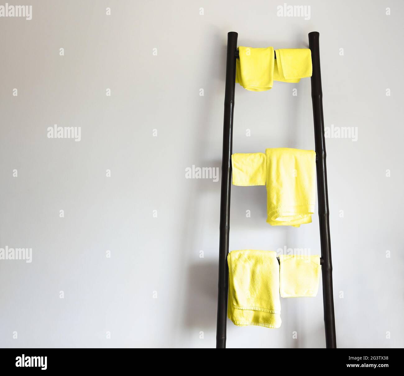 Illuminating yellow towels hanging on rustic wooden ladder. It's pretty, functional and takes up minimal wall space. Wall background with copy space. Buy wooden towel ladders and get the best deals at the lowest prices on ebay! This towel storage structure is sleek and elegant.